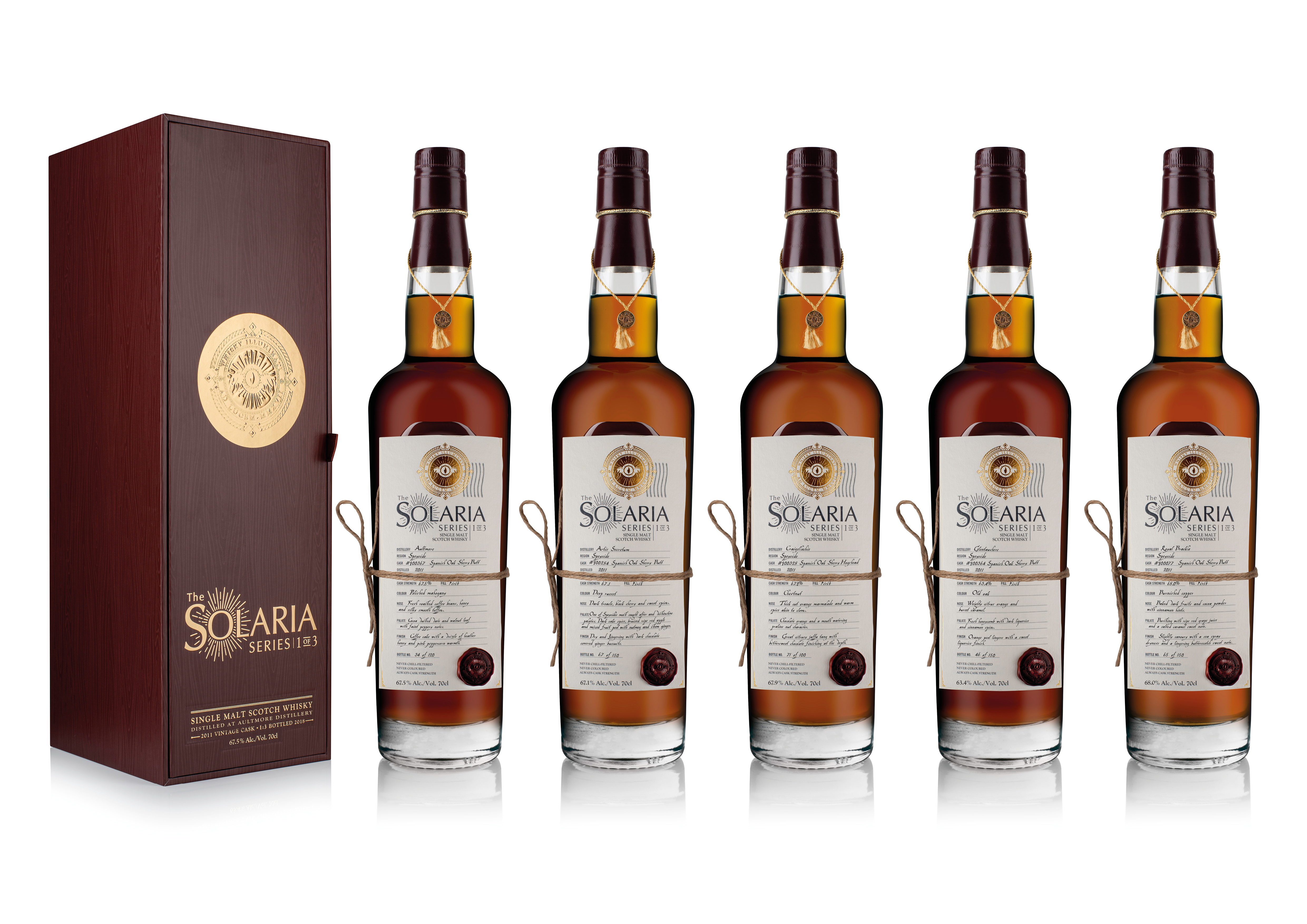 Each release was matured in first-fill Spanish Oak Sherry Butt casks, with the exception of the Solaria Series from Craigellachie Distillery, which was matured in a first-fill Spanish Oak Sherry Hogshead cask.